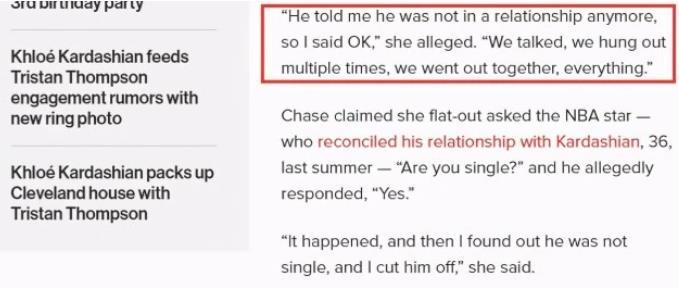 4月27日,美国媒体PAGE SIX报道,网红模特Sydney爆料,汤普森曾经瞒着科勒和自己多次约会,Sydney表示自己会和汤普森约会是因为TT告诉自己,他已经和卡戴珊结束了恋情,不过随后Sydney发现TT撒谎了,她也主动地和汤普森结束了一起,值得一提的是,这是Sydney第二次在媒体上提到这件事情,或许是为了证明两者的亲密程度,Sydney表示她和汤普森多次约会、聊天,一起出去玩,一切。