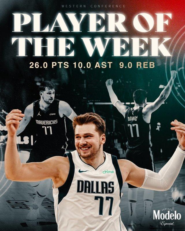 对活塞一战,东契奇贡献30分10篮板9助攻2抢断;对湖人的两场比赛,东契奇分别得到30分9篮板8助攻3抢断和18分8篮板13助攻。如果东契奇能够在季后赛开始前再拿一次周最佳,他就能追平2009-10赛季的诺维茨基(4次)创造的独行侠队史单赛季周最佳纪录。赛季至今,东契奇场均贡献28.5分8篮板8.8助攻,得分和篮板数据比上赛季略有下降,但依然表现全面。