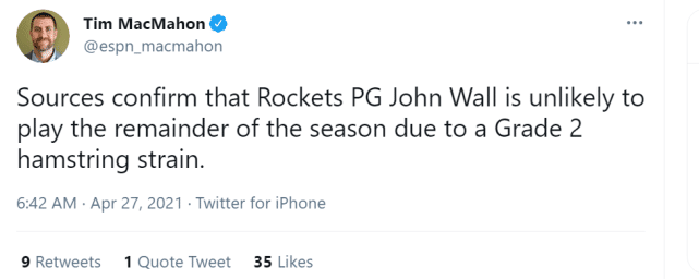 来源:24直播网04-27 15:2124直播网讯 北京时间4月27日,据名记查拉尼亚报道,火箭后卫约翰-沃尔因腿筋拉伤将缺席本赛季余下的所有比赛。火箭已经提前无缘季后赛,沃尔这时候被安排“赛季报销”,显然也是球队为了试验新阵容,当然,也得继续摆烂,确保能以倒数前三的成绩结束本赛季。随后,名记麦克马洪跟进报道,沃尔遭遇腿筋二级拉伤。
