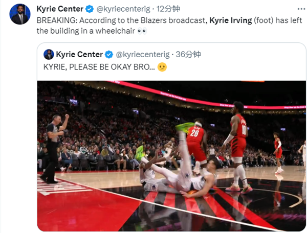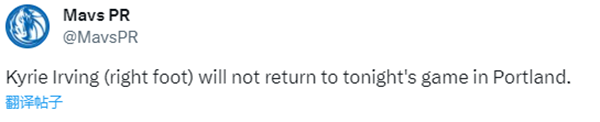 受伤离场前,欧文出战13分钟,6投4中拿到11分2篮板2助攻1抢断;据报道,欧文因脚伤坐着轮椅离开球馆,之后独行侠官方宣布,欧文因右脚受伤,本场比赛不会回归。