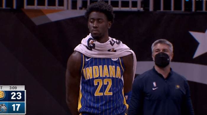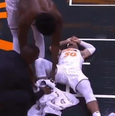 首节比赛,德文-坎纳迪在一次回防当中落地时受伤,明显的右腿受伤,痛苦倒地;地板上甚至出现了血迹,班巴一脸担忧,随后德文-坎纳迪被担架抬离球场,现场球迷以及两队球员和教练组都为他鼓掌祈祷,离场时德文-坎纳迪忍痛向球迷致敬,举手向球迷示意,如此画面真是令人泪目。