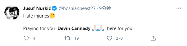 开拓者球员努尔基奇发推为德文-坎纳迪祈祷,写道:憎恨伤病,我在这里为你祈祷;众所周知,努尔基奇也是遭遇伤病困扰,太能理解德文-坎纳迪的心情,但愿伤病远离所有球员,伤病不断太揪心了。