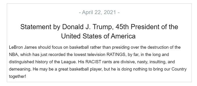 特朗普指责詹姆斯不明真相就乱发表观点“詹姆斯应该把注意力放在篮球上,而不是引导NBA的毁灭。NBA刚刚创下了悠久历史以来的最低收视率纪录。他的种族主义分裂的、可恶的、无礼的且具侮辱性的,他可能是一个伟大的篮球运动员,但他从未做任何事来团结我们的国家。”