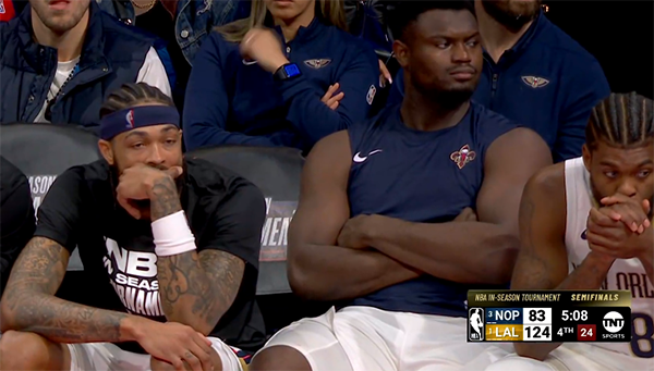 在季中半决赛,鹈鹕44分惨败湖人,23岁的锡安被即将39岁的詹姆斯打爆了,锡安全场拿到13分3助攻2篮板,两次被詹姆斯造进攻犯规,由于落后太多,锡安早早认输,坐在替补席时一脸落寞和沮丧。