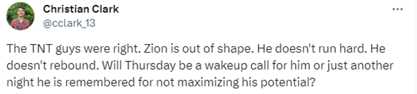 Christian Clark还发推写道:TNT那些家伙是对的,锡安的体型走样了,他跑的不努力,他不会反弹,周五对他来说是一个警钟还是又一个他因没有最大限度地发挥潜力而被人们铭记的夜晚?