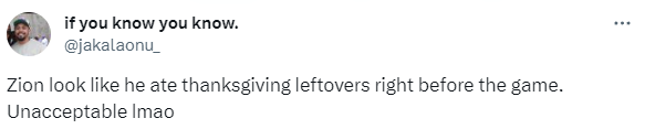 还有球迷表示:锡安看起来像是在比赛前吃了感恩节剩菜,不可接受!