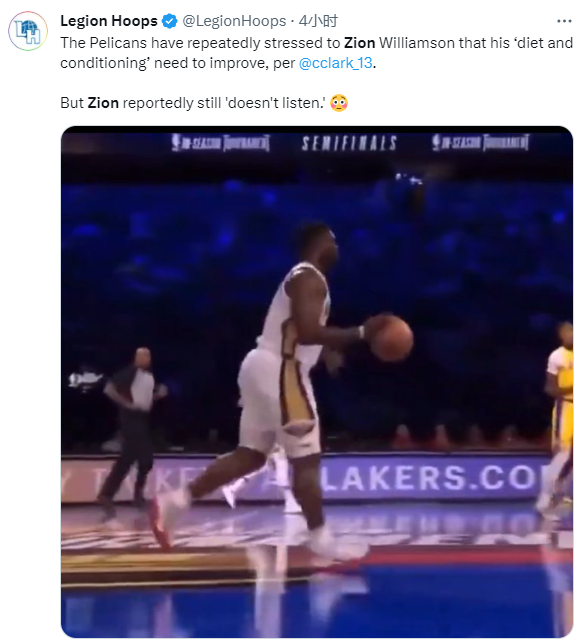 据鹈鹕记者Christian Clark报道,鹈鹕曾多次告知锡安需要改善自己的饮食和体能,但锡安始终听不进去,没有听取球队的意见