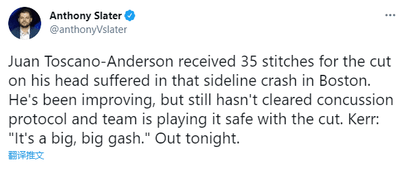 28岁安德森拼命救球导致脑袋受伤,足足缝了35针,目前安德森正在养伤,伤口需要愈合;科尔透露安德森没有出现呕吐或者眩晕的情况,除了缝针之外,安德森接受脑震荡测试。