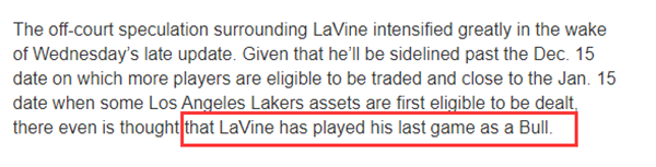 在拉文的最新伤情更新后,关于拉文的场外猜测大大加剧了,考虑到拉文预计将在1月中旬复出,届时将有更多的球员有资格被交易,洛杉矶湖人队的一些球员可以被交易,外界甚至有人认为拉文已经打完了他在公牛队的最后一场比赛。