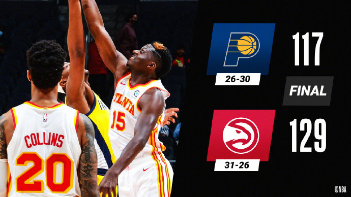 老鹰129-117战胜步行者 特雷-杨34+5+11 卡佩拉25+24