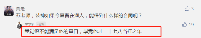 也有网友发出疑问,“苏老师,庄神如果今夏留在湖人,能得到什么样的合同呢”。而苏群老师的回应很直接,“我觉得不能满足他的胃口,毕竟他在二十七八,当打之年”。