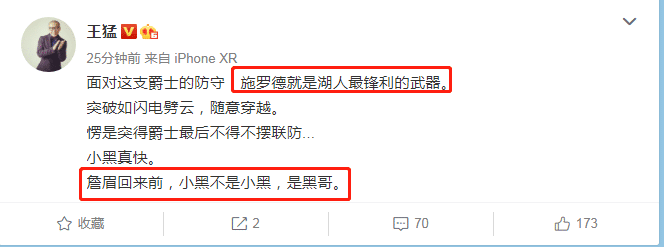 施罗德砍下25分6篮板8助攻,连续命中关键球,赛后,小黑坐在技术台接受采访,非常霸气。解说员王猛评价施罗德,面对爵士的防守,施罗德就是湖人最锋利的武器,在詹眉回来前,小黑不是小黑,是黑哥。