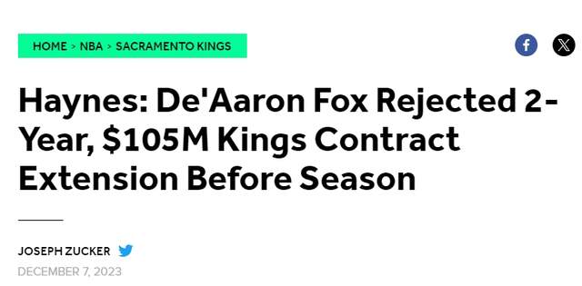 根据报道,2年1.05亿是国王目前允许给出的最高报价,这一报价是在本赛季开始前国王向福克斯提出的,遭到拒绝。福克斯的经纪人是里奇·保罗,后者以擅长为客户带来丰厚合同而闻名于NBA。如果本赛季福克斯再度入选最佳阵容,他将有机会和球队签下4年2.45亿美元的超级顶薪续约合同。