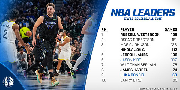 3、东契奇赛季第4次三双,生涯第60次拿到三双
