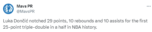 2、东契奇成为历史上第一位半场拿到25+三双的球员