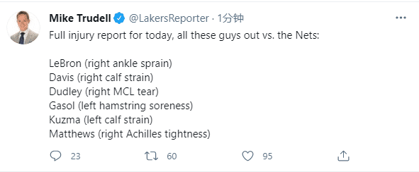 来源:24直播网04-11 15:5724直播网讯湖人对阵篮网之前,湖人队伤病大名单再次更新,全队多达6名球员因伤无法出战,据湖人随队记者Mike Trudell报道,詹姆斯(脚踝扭伤)、浓眉(小腿拉伤)、库兹马(小腿拉伤)、小加索尔(左腿筋酸痛)、马修斯(右跟腱紧张)和杜德利(韧带伤病)全都伤停,卫冕冠军太惨了。