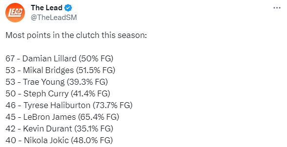 美媒The Lead晒出本赛季球员关键得分榜单,詹姆斯45分排在联盟第六位,投篮命中率65.4%,杜兰特42分排在第七位,投篮命中率35.1%;排在前五位的依次是利拉德(67分)、布里奇斯(53分)、特雷-杨(53分)、库里(50分)和哈利伯顿(46分)。