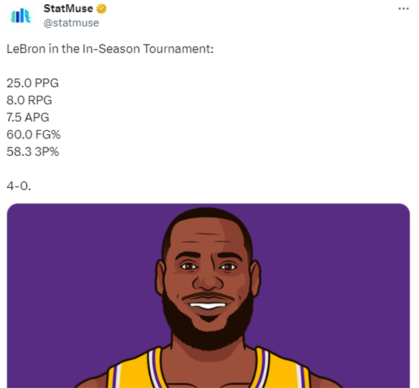 在季中赛小组赛期间,湖人4胜0负以西部第一的身份晋级八强,詹姆斯场均拿到25分8篮板7.5助攻,投篮命中率60%,三分命中率58.3%。