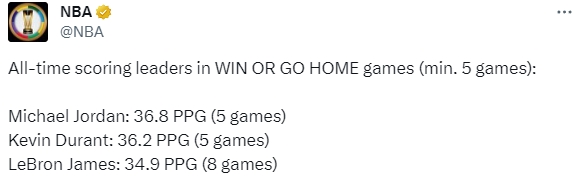 詹姆斯和杜兰特大战引热议,NBA官方晒合影和数据为比赛预热,在NBA历史上赢或者回家的淘汰赛生涯场均得分上(至少打5场),乔丹场均36.8分历史第一(5场),杜兰特36.2分历史第二(5场),詹姆斯34.9分历史第三(8场)。