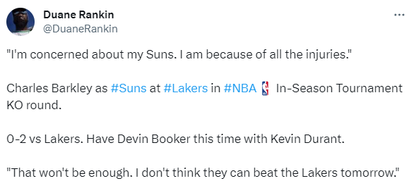 詹杜以及湖日大战引热议,太阳名宿巴克利看好湖人晋级,他在节目中表示:我因太阳的伤病而担心他们,比尔无法接近复出。他们之前对湖人是0胜2负,虽然布克可能能和杜兰特一起出战,但是我认为这也不足以击败湖人。