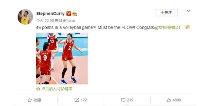 说完坏人品的,我们再来说说优质偶像——库里,这次库里再一次出现在镜头面前,竟然是和我们女排球员——朱婷有关。近日,在全运会赛场上,代表家乡河南女排征战的朱婷在比赛中虎虎生威,带领球队4战3胜,在对阵强大的辽宁女排时,朱婷更是带队3:2逆转辽宁女排,个人全场拿下46分。
