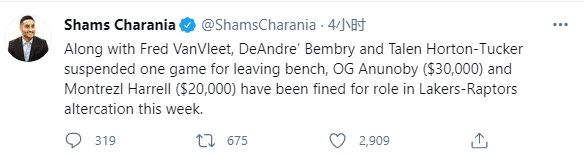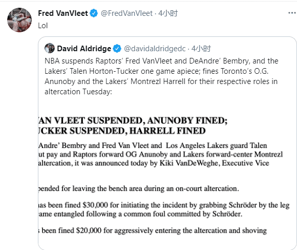 来源:24直播网04-09 14:4224直播网4月9日讯此前湖人和猛龙冲突处罚结果,据名记shams报道,阿奴诺比和哈雷尔被联盟追加罚款,合计5万美元;范弗利特、本布里和霍顿-塔克因离开板凳席被禁赛一场;两人被罚款以及三人被禁赛累计损失约17万美元,随后NBA官宣这一处罚结果,猛龙主力范乔丹发推回应此事。