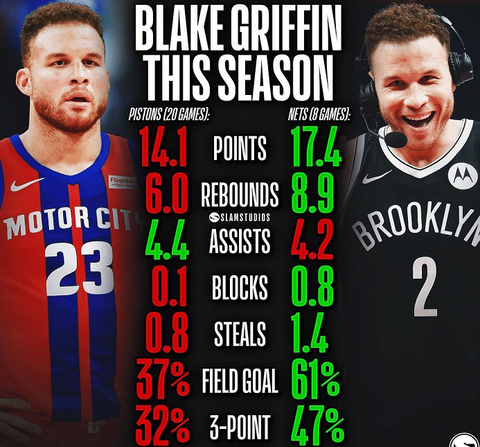 通过数据可以看出来,格里芬来到篮网之后的表现真的是有明显的提高,要知道本赛季在活塞,格里芬虽然也有带队击败卫冕冠军湖人的经典战,但他的数据并不是很好,本赛季在活塞,格里芬的正负值仅仅只有-3.6,在比赛贡献值数据8.4,联盟第202名。但是来到篮网,格里芬的表现也是有目共睹的,他替补上场之后可以通过三分球和防守很好的帮助到篮网。