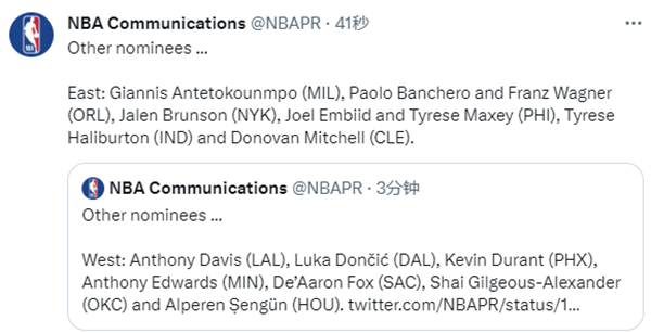 来源:24直播网12-05 15:5924直播网12月05日讯 ,NBA官方正式公布2023-24赛季10月和11月东西部月最佳球员,塔图姆和约基奇当选,杜兰特、浓眉、字母哥、恩比德等球星获提名,约基奇继续刷新队史纪录;切特力压文班亚马生涯首夺西部月最佳新秀,热火球员哈克斯夺得东部月最佳新秀,也是生涯首次获此殊荣。
