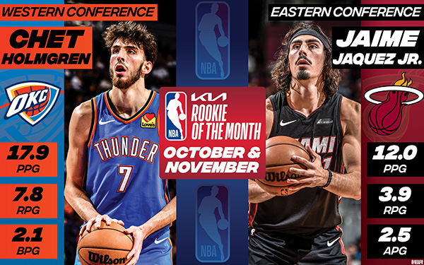 霍姆格伦力压文班亚马,当选了本赛季首次西部月最佳新秀。10-11月的比赛中,霍姆格伦场均贡献17.9分7.8篮板2.6助攻2.1盖帽,投篮命中率53.7%,三分命中率41%,罚球命中率87.1%。雷霆官方晒海报祝贺他获奖。