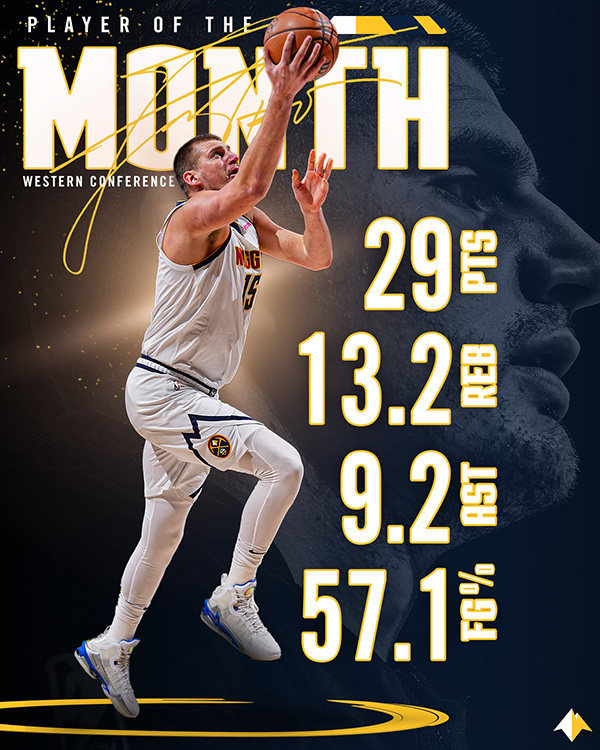 本赛季的第一次西部月最佳奖项,属于掘金的约基奇。这是约基奇生涯第7次当选月最佳。10-11月的比赛中,约基奇场均贡献29分13.2篮板9.2助攻1.4抢断,投篮命中率57.1%,三分命中率31.6%,罚球命中率80%。掘金取得13胜6负的战绩,暂列西部第三。掘金官方晒海报祝贺约基奇,并写道:“从他停下的地方继续。”