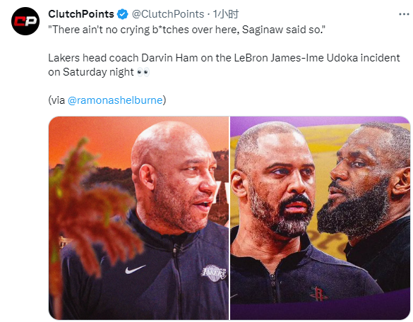 对于詹姆斯和乌度卡争吵一事,据名记Ramona Shelburne报道,湖人主帅哈姆的回应是:这里没有哭哭啼啼的贱人。