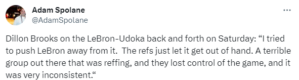 从灰熊到火箭,狄龙和詹姆斯之间话题一直引热议,今日训练之后,狄龙回应詹姆斯和火箭主帅乌度卡争吵事件,狄龙表示:我试图把勒布朗推开,但裁判失去了控制,那是一个糟糕的执教团队,他们失去了对比赛的控制,而且非常不稳定。而这也是不稳定吹罚所带来的最终结果,一些毫无意义的废话。