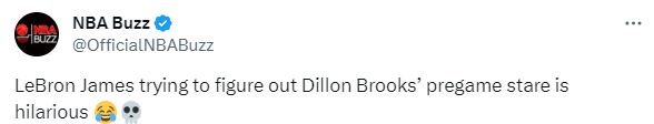 在湖人和火箭三番战赛前,狄龙又是一动不动地凝视远方,难道他又是在凝视詹姆斯吗?有趣一幕曝光,狄龙站在原地凝视,詹姆斯双手抄兜走过来,然后站在狄龙附近,一边运球一边盯着狄龙看,美媒NBA Buzz配文写道:勒布朗-詹姆斯试图弄清楚狄龙的赛前凝视,太搞笑了。