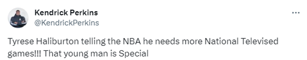 哈利伯顿生涯第二次打全美直播的比赛,名嘴帕金斯发推呼吁:哈利伯顿用自己的表现告诉NBA,他需要更多的全美直播!这个年轻人非常特别!