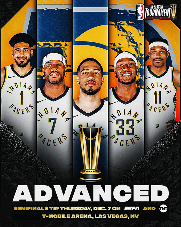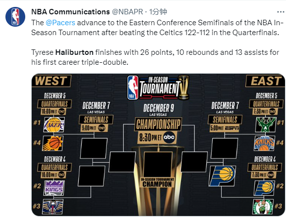 步行者成为NBA历史首届季中锦标赛第一支四强球队,他们将在下一轮对阵雄鹿与尼克斯之间的胜者。