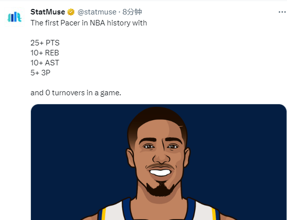 2、哈利伯顿成为步行者队史第一位单场至少拿到25分10篮板10助攻+5记三分且0失误的球员