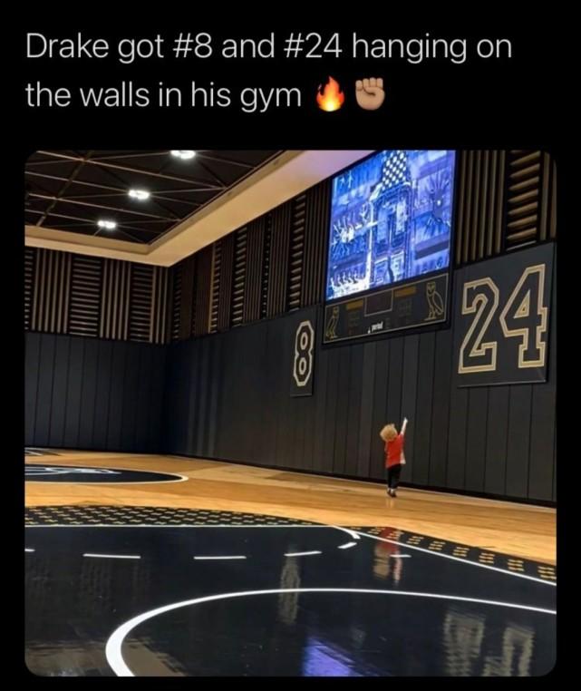 加拿大歌星德雷克也在用自己的方式致敬科比,他在自家的篮球场墙上配了巨大的8号和24号。德雷克和科比的私交很不错,对于这位故友,他也是满怀思念。