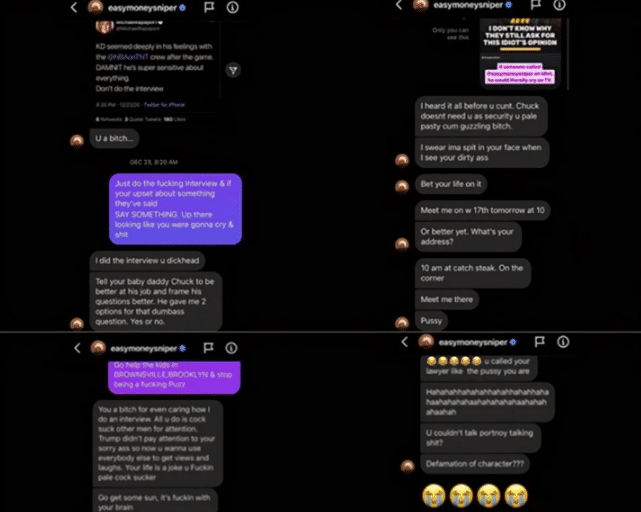 来源:24直播网04-06 11:2524直播网讯 前段时间杜兰特最大的新闻就是被联盟罚款5万美元,这件事情的起因是演员迈克尔-拉帕波特(Michael Rapoport)在社交媒体上公开了他和杜兰特之间的聊天记录,其中很明显杜兰特有很多不当的言论,使用侮辱性的词语,其中就包括歧视等等。虽然杜兰特很快就进行了道歉,但据悉迈克尔-拉帕波特没有接受杜兰特的歉意,而且还找到了律师,希望进行维权。后期这件事情以NBA联盟罚款杜兰特5万美元而结束,但对于迈克尔-拉帕波特来说,这件事情并没有这么简单。