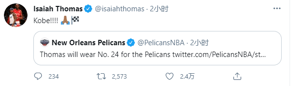 目前小托马斯个人社交媒体的头像是他与科比在全明星赛场上的合影,他选择改穿24号向科比致敬;但愿小刺客能在10天合同期内证明自己,证明自己还能打NBA,更希望他能拿到一份正式合同。