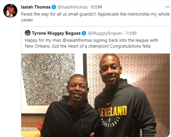 小托马斯正式签约鹈鹕之后,地表最强160马格西-博格斯发推,晒合影:为小托马斯签约鹈鹕重返联盟而高兴,拥有一颗冠军的心,恭喜你;小托马斯回应老前辈:你为我们所有的小个子后卫铺平了道路,感谢你对我整个职业生涯的指导!