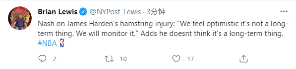 篮网赢球固然可喜,不过哈登因腿筋伤势而提前退赛,赛后篮网主教练纳什透露哈登最新伤情,他表示:这是球队在看了哈登的腿筋伤势之后做出的决定,我们只是觉得不值得冒这个险让他继续留在场上;我们对哈登的伤势感到乐观,他不会长期缺席比赛,我们将会对此进行监控;篮网将会在明天决定哈登下一场对阵黄蜂的状态。