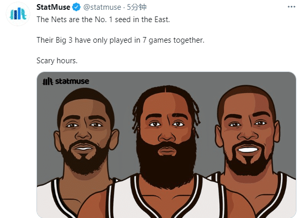 美媒statmuse发推写道:篮网东部第一,杜兰特、哈登和欧文三巨头仅仅只在一起打过7场比赛,恐怖时刻(这是哈登最喜欢用的词语);试想一下,若杜兰特伤愈复出,阿德也能出战,再加上哈登、欧文以及格里芬等人,完全体篮网将会更加恐怖至极。