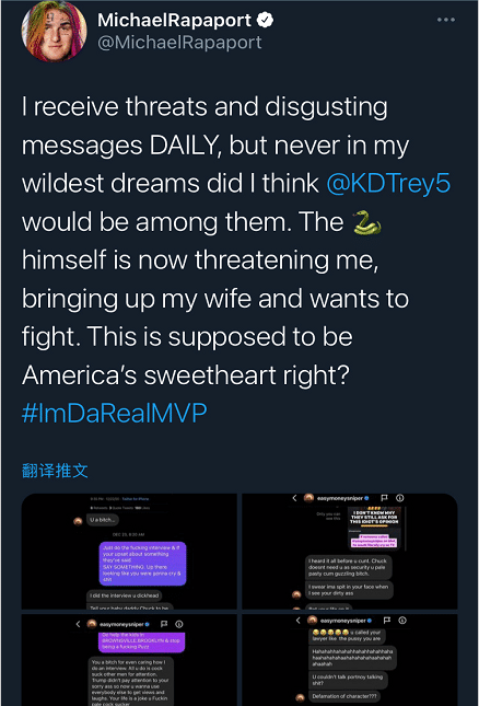 这件事情的起因是在3月30日晚上,知名演员迈克尔-拉帕波特(Michael Rapoport)在社交媒体上更新了数张聊天记录的不同,上面是他和杜兰特之间的骂战,多次用‘ Bit ’ 开头的词汇,而且还有涉及到拉帕波特妻子的言论。这其中杜兰特还希望得知拉帕波特的地址,希望和对方约架。