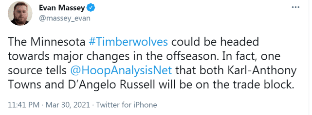 森林狼也不是没有尝试围绕唐斯建队。2020年2月,他们用维金斯为核心的筹码换来勇士的拉塞尔。可是拉塞尔加盟森林狼后,常常受到伤病困扰。目前他只为森林狼打过32场比赛,场均20.2分3.3篮板5.6助攻。