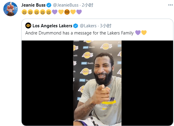 在新闻发布会上,庄神高呼湖人国度,直言:我非常非常兴奋来到这里,加盟湖人是一种荣耀,希望能够帮助湖人再拿一座总冠军;珍妮-巴斯转发庄神对湖人球迷的寄语,并且配上多个开怀大笑的表情。