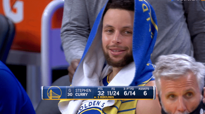 末节勇士替补阵容继续扩大分差,库里上来又打一会便打卡下班,仅打一个回合就下场,坐在替补席露出笑容,最终勇士主场轻116-102松击败公牛。