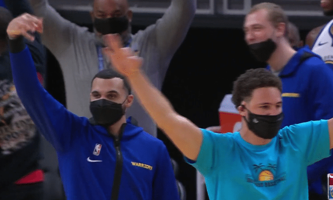 不过这场比赛中最抢眼的并非是库里,而是追梦格林,此役砍下11分5板9助的他还连续命中三分球,其中还不乏一记压哨的Logo shot,这是在上半场,普尔进攻遇阻的情况下回传给了中圈附近的追梦格林,马上就要到时间的情况下追梦格林直接出手三分球命中,非常精彩,克莱等人也都从板凳席上起身欢呼庆祝。