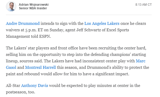为何庄神最终选择加盟湖人?espn名记曝光真因,一是湖人球星们竭尽全力地招募庄神,二是湖人愿意给他首发中锋的位置,由于本赛季小加索尔和哈雷尔的表现不同,湖人想要德拉蒙德保护内线和篮板。
