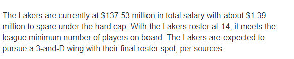 在本赛季剩余赛季中,庄神签约湖人将拿到约79万美元,这是他和骑士买断时损失的薪水;目前湖人距离硬工资帽还有大概95万美元,还能签下第15名球员;签约庄神还有一个引援计划,湖人将利用最后一个空余名额追求一位3D侧翼球员。