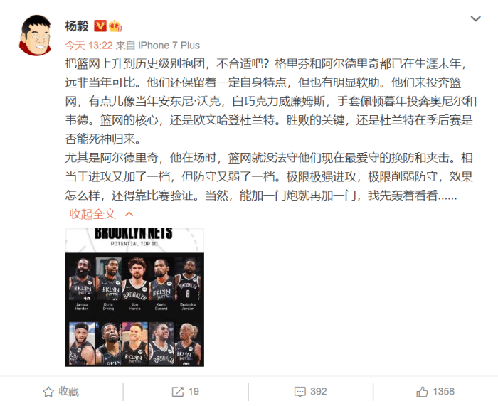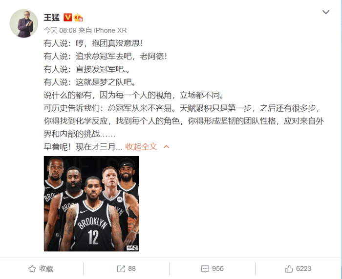 宝岛名嘴朱彦硕老师提醒篮网球迷,别忘了他们在13年组建豪阵的经历!那时候的老板还是俄罗斯首富,他送走了球队未来的大部分选秀权与凯尔特人交易来了年迈的皮尔斯、加内特和特里,再加上原有的德隆、洛佩兹、乔约翰逊,甚至还有基里连科、布拉切这些我们耳熟能详的球员,可结果呢?从未闯入过东部决赛!